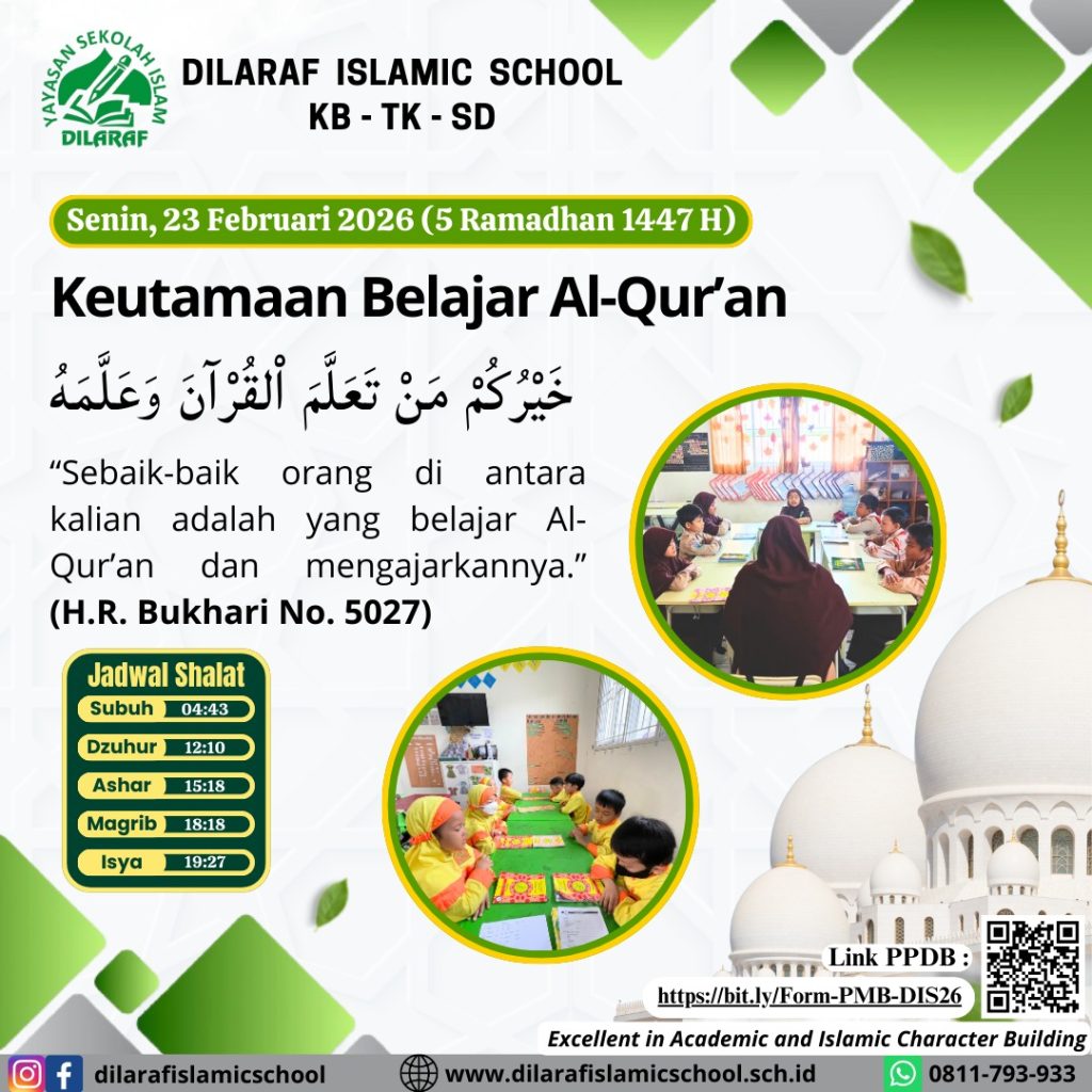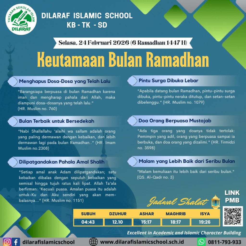 Alhamdulillah, SD Dilaraf Islamic School telah melaksanakan kegiatan Tarhib Ramadhan dengan tema “Ramadhan Ceria, Generasi Qur’ani, dan Berakhlak Mulia.” Kegiatan ...