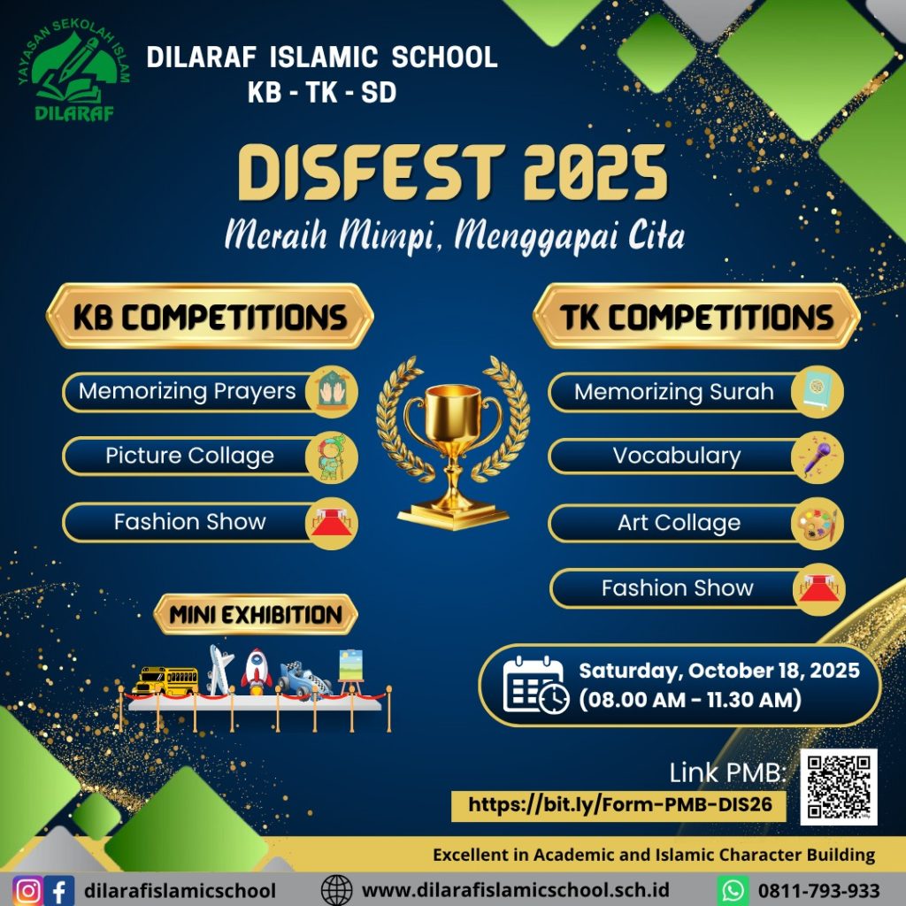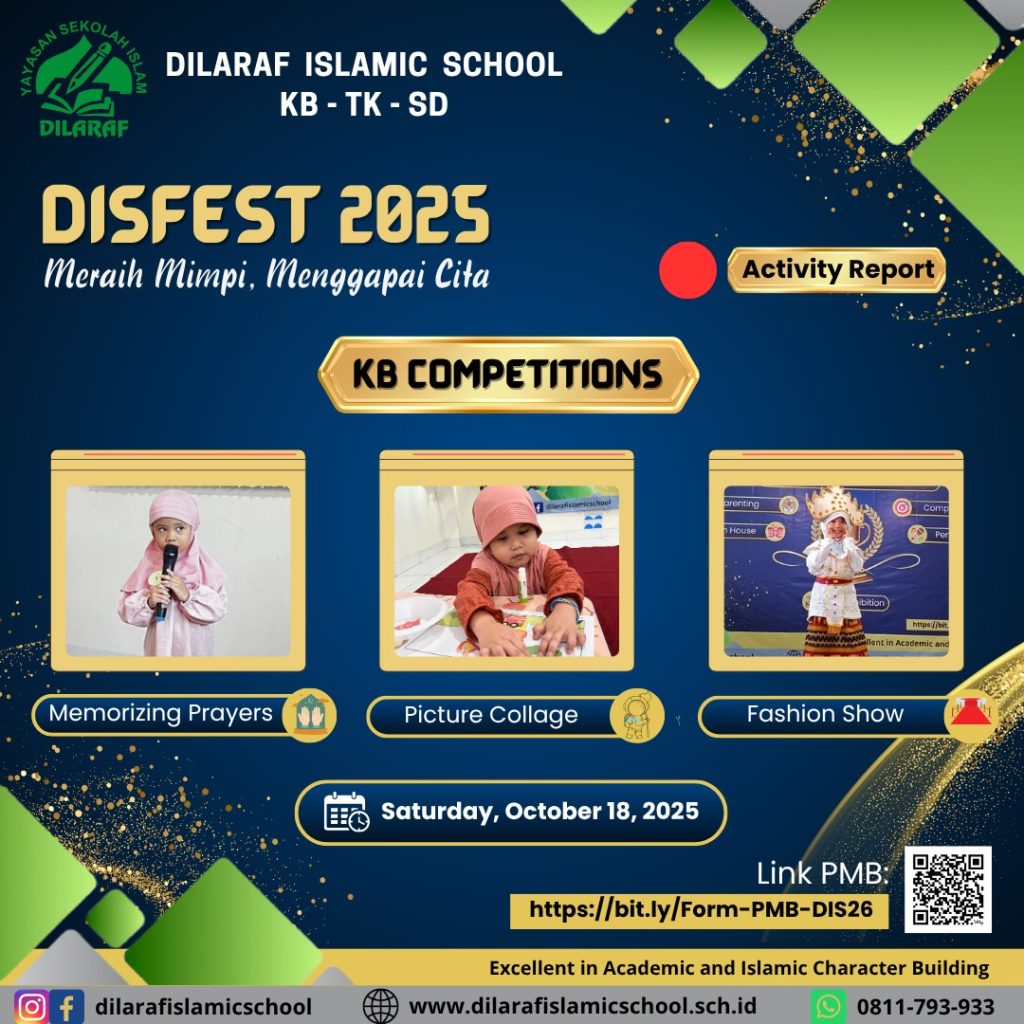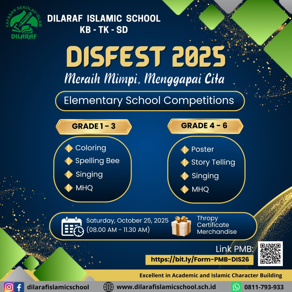 بسم الله اَلسَّلاَمُ عَلَيْكُمْ وَرَحْمَةُ اللّهِ وَبَرَكَاتُهُ Alhamdulillah rangkaian perlombaan KB – TK dalam kegiatan Dilaraf Islamic School Festival (DISFest 2025) telah terlaksana dengan baik. Ananda hebat telah berani mencoba dan berpartisipasi dalam perlombaan. Semoga dengan adanya kegiatan ini dapat meningkatkan bakat, minat dan keberanian Ananda. Insya Allah pemenang akan diumumkan pada hari Ahad, 09 […]