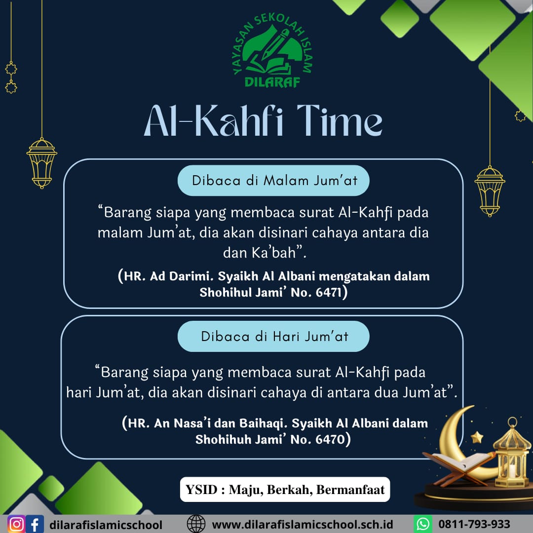 “Barang siapa yang membaca surat Al-Kahfi pada hari Jum’at, dia akan disinari cahaya di antara dua Jum’at”. (HR. An Nasa’i dan Baihaqi. Syaikh Al Albani dalam Shohihul Jami no. 6470)