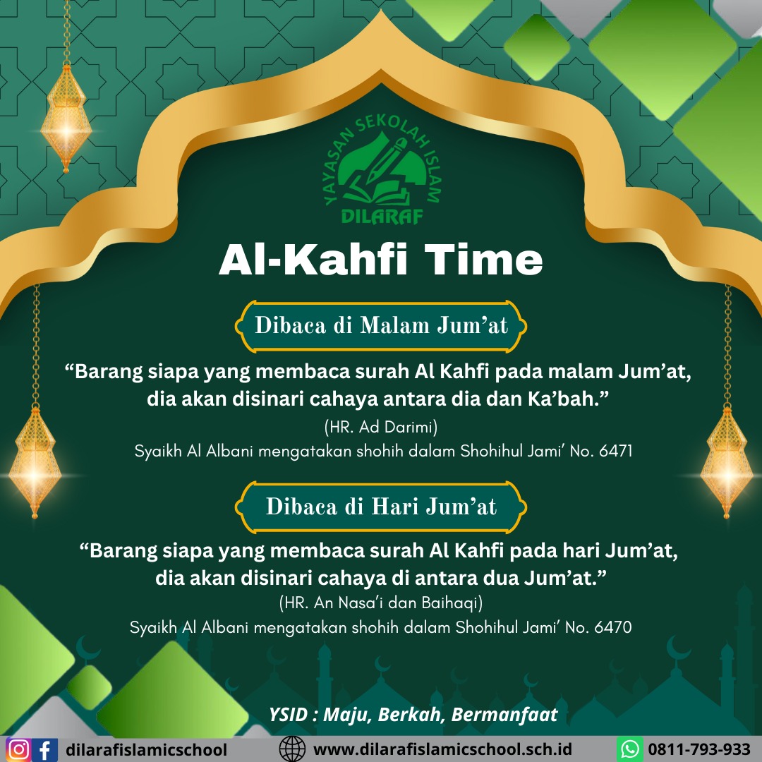 “Barang siapa yang membaca surat Al-Kahfi pada hari Jum’at, dia akan disinari cahaya di antara dua Jum’at”. (HR. An Nasa’i dan Baihaqi. Syaikh Al Albani dalam Shohihul Jami no. 6470)
